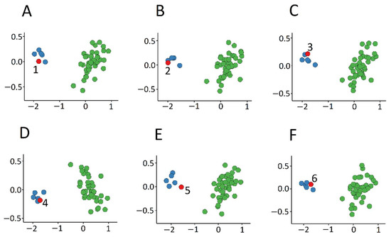 6-fold cross-validation multidimensional scaling. In each of the steps (A–F), the red circle represents one of the Patients 1–6, respectively.