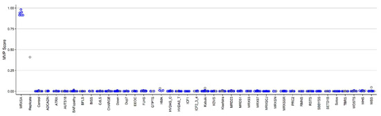 First, we only used samples from controls and samples from individuals with MRXSA for training the model, and supplied over 1000 control subjects and cases of 38 other constitutional disorders with episignatures from the EKD [19] (Table 2) into the model in order to assess the specificity of our classifier. The classifier showed a high sensitivity for MRXSA, with all samples scoring high on the MVP axis (Figure 4). The specificity, defined as the MVP score >0.5 was over 99%, with 5 samples from other disease cohorts and controls (totaling >1000 samples) scoring above that cut-off. Three of those cases are from the cohort of patients with Chr5q35-qter duplication and a clinical diagnosis of Hunter McAlpine craniosynostosis syndrome, suggesting level of similarity in the corresponding episignature.