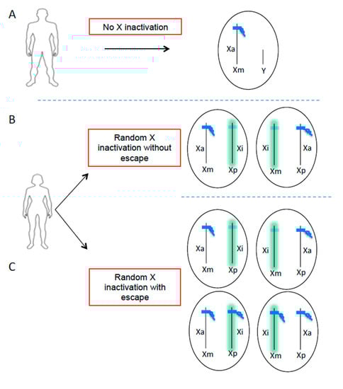 - Fang, H.; Disteche, C.M.; Berletch, J.B. X Inactivation and Escape: Epigenetic and Structural Features. Front. Cell Dev. Biol. 2019, 7, 219. [Google Scholar] [CrossRef]
