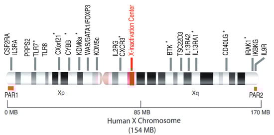 Due to the imbalance of X chromosome between females (XX) and males (XY), regulation of X-linked gene dosage is strictly necessary. Abnormal increase in X-linked gene expression due to the presence of the extra X chromosome in females leads to developmental dysfunction [13]. Therefore, in female mammals, one of the two X chromosomes is randomly inactivated, in the early embryo, to balance the dosage of gene expression between the sexes. The process of X chromosome inactivation (XCI) results in cellular mosaicism (Figure 1), where about half of the cells in a tissue express genes from the maternal X chromosome and the other half from the paternal X chromosome [13]. However, the pseudo-autosomal regions (PAR) of the X chromosome, PAR1 and PAR2, do not undergo XCI (Figure 2). These regions carry a minority of X-linked genes with functional homologues on the Y chromosome, and these genes (e.g., CSF2RA, SLC25A6 and IL3RA on PAR1 or IL9R on PAR2). Indeed, these telomeric regions are the only part sex chromosomes that can recombine in male meiosis [14]. Most of the genes outside the pseudo-autosomal regions, however, are unique to the X chromosome with two copies in women and only one in men. Most of these genes encode proteins and microRNAs known to directly or indirectly regulate the immune response [8,15,16]. Loss-of-function mutations in some of these genes (e.g., BTK, WAS, IL2RG, FOXP3) cause primary X-linked immune deficiencies [8]. The X chromosome is known to contain the largest number of immune-related genes of the whole human genome (Figure 2). The endosomal Toll-like receptor (TLR) genes, TLR7 and TLR8, of the non-pseudo-autosomal region of Xp, attest to non-redundant vital functions [17]. In support of the key role of TLR7 in certain infections, a recent study has identified loss-of-function mutations of TLR7 associated with severe forms of COVID-19 in young men, suggesting a key role of TLR7 in the protective response against SARS-CoV2 [18]. However, XCI is incomplete and 15–23% of human X-linked genes escape XCI (Figure 1), and are thus overexpressed from both the active (Xa) and inactive (Xi) X chromosome in certain tissues or individuals [19,20].