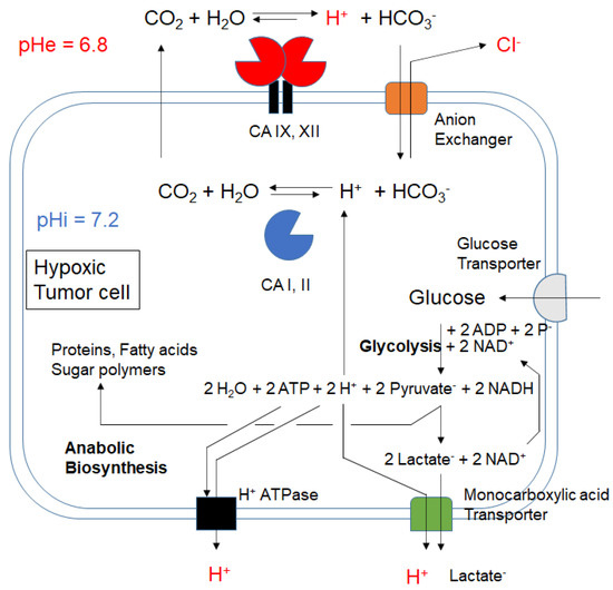 Carbonic anhydrases (CAs) are metalloenzymes ubiquitously present in both prokaryotes and eukaryotes, where they serve as catalysts for the reversible hydration of CO2 to bicarbonate and a proton. Eight separate gene families encode for these enzymes: α-, β-, γ-, δ-, ζ-, η-, θ-, and ι-CAs [8,12]. The α-CAs are the only group found in mammals, with 14 different CA isozymes being described in humans (hCAs) [8,12]. Of these hCAs, two isozymes are mitochondrial (CA VA and CA VB), five isozymes are present in the cytosol (CA I, CA II, CA III, CA VII, and CA XIII), four isozymes are membrane-bound (CA IV, CA IX, CA XII, and CA XIV), and one isozyme is secreted in saliva and milk (CA VI) [8,12]. Through these isozymes, CA plays an important role in respiration and CO2 excretion, pH homeostasis, secretion of electrolytes, gluconeogenesis, lipogenesis and ureagenesis, bone resorption and calcification, and tumorigenicity [8,12]. Focusing on tumorigenicity, it must be emphasized that CA IX and CA XII play central roles in hypoxic tumor cell biochemistry (Figure 1) [6,8,9,13]. A lack of oxygen triggers upregulation of glycolysis as the main source of ATP production, with pyruvate being converted to lactate to regenerate NAD+. Glycolysis produces protons which are combined with intracellular HCO3− to produce CO2 and H2O in a reaction catalyzed by cytosolic CAs, especially CA I and CA II. Carbon dioxide passes through the cell membrane, and it is rehydrated outside the cell by overexpressed CA IX and CA XII isozymes to generate HCO3− and H+. The bicarbonate ion is imported back into the cell and exchanged with Cl− via anion exchangers. The tandem action of cytosolic isozymes with the overexpressed membrane-bound CA IX and CA XII allows the efficient transport of cytosolic protons formed in massive amounts from upregulated glycolysis from inside the tumor cell to the extracellular milieu in an ATP-independent manner. Thus, the pH of the cytoplasm of tumor cells is maintained within normal limits while acidifying the extracellular environment, with detrimental consequences for the normal cells surrounding the tumor (Figure 1) [6,9,13].