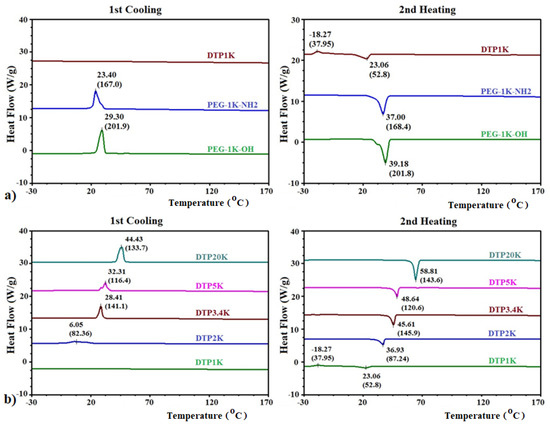 Comparative differential scanning calorimetry (DSC) thermograms (5 °C/min heating/cooling rate) of (a) polyethylene glycol (PEG)-1K-OH and PEG-1K-NH2 versus PEGylated bis-sulfonamide DTP1K 28 and of (b) PEGylated bis-sulfonamides DTP2K 23 and DTP1K 28–DTP20K 31: values in parentheses are the integrated heat signals. Tc and Tm were heating/cooling-rate dependent (data not shown).