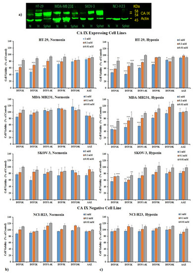 All of the PEGylated bis-sulfonamides DTP2K 23 and DTP1K 28–DTP20K 31 were tested in 2D and 3D (tumor spheroids) cancer cell models, either expressing CA IX (HT-29 colon cancer, MDA-MB 231 breast cancer, and SKOV-3 ovarian cancer) or CA IX-negative cells (NCI-H23 lung cancer) [52,53,54,55,56,57,58,59,60,61,62,63,64,65,66,67,68,69]. The expression of CA IX under normoxic and hypoxic conditions was previously validated through western blotting (Figure 3a) [52,53,54,55,56,57,58,59,60,61,62,63,64,65,66,67,68,69].