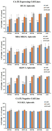 Effect of PEGylated CAIs DTP2K 23 and DTP1K 28–DTP20K 31 and acetazolamide AAZ 1 at three different concentrations on the viability of CA IX expressing HT-29, MDA-MB231, and SKOV-3 and of CA IX-negative NCI-H23 3D cell cultures (all 3D tumor spheroids): the p values were determined by one-way ANOVA, comparing the value with that of acetazolamide 1 (* p < 0.05, ** p < 0.01, and *** p < 0.001). Only the statistically significant differences are shown.