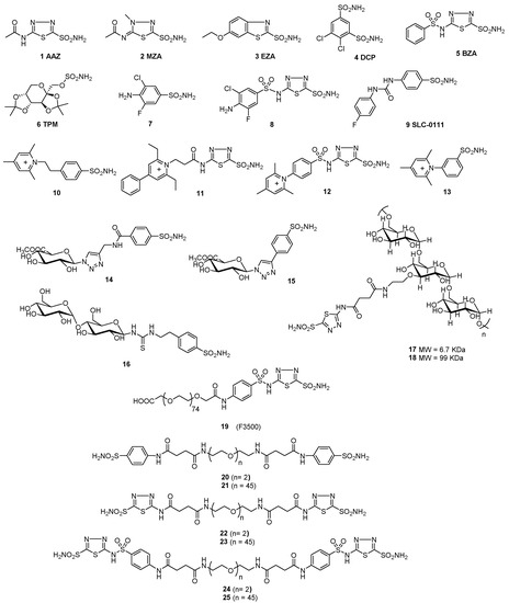 Representative CA inhibitors (CAIs) used in the clinic (1–6) and selective CAIs with selectivity against membrane-bound CA isozymes (7–25).