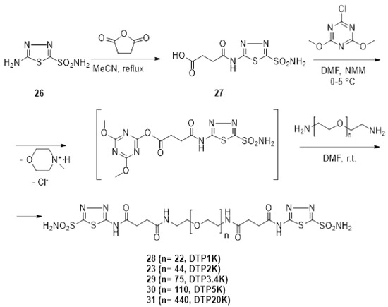 The new series of compounds 23 and 28–31 were synthesized following previously reported procedure (Scheme 2) [52]. The starting 5-amino-1,3,4-thiadiazole-2-sulfon- amide 26 was synthesized as previously described [31,72,73]. The succinyl derivatives 27 was generated from the condensation of 5-amino-1,3,4-thiadiazole-2-sulfonamide 26 with succinic anhydride in acetonitrile at room temperature. The carboxy group of succinylamido sulfonamide was subsequently activated with 2-chloro-4,6-dimethoxy-1,3,5-triazine (CDMT)/N-methylmorpholine (NMM) [52,74,75] and was condensed with diamino polyethylene glycols having different PEG lengths to yield the bis-sulfonamides 28–31. These compounds were purified by flash chromatography and characterized by standard analytical methods (see the Materials and Methods section).