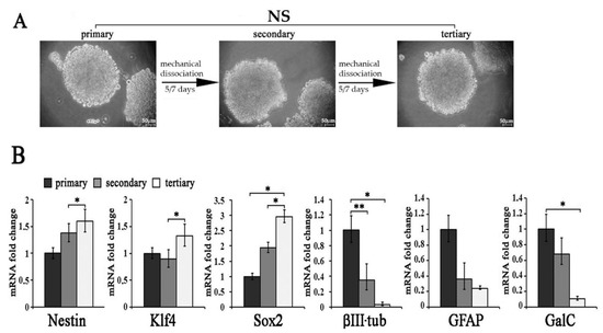 To study the staminal properties of A1 neurospheres, we subjected und-Ns to sequential passaging. Primary neurospheres, dissociated and cultured in neurosphere culture medium again, developed into secondary spheres, which, in turn, formed tertiary spheres (Figure 2A). To assess whether long-term A1 neurosphere culture affected staminal and neural gene expression, we studied the mRNA expression of the staminal markers Nestin, Klf4 and Sox2, the early neuronal marker β III tubulin, the astroglial marker GFAP and the immature oligodendroglial marker GalC in primary, secondary and tertiary A1 neurosphere cultures. As shown in Figure 2B Nestin, Klf4 and Sox2 mRNA levels were upregulated in tertiary neurospheres as compared to primary or secondary spheres, while β III tubulin and GalC transcription decreased in tertiary spheres as compared to primary or secondary spheres. GFAP expression showed no significant difference in the neurospheres subjected to sequential passages. These data suggested an increased proliferative capacity and a reduced expression of neuronal and oligodendroglial mRNAs in long-term passaged A1 neurosphere cultures. This finding is consistent with data reported in the literature showing that secondary and tertiary neurospheres tend to decrease neuronal and astroglial markers, whereas staminal markers such as Nestin and Sox2 are augmented [23,24,25].