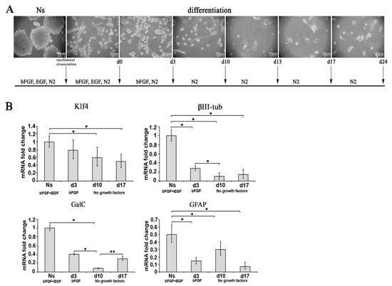 Characterization of diff-Ns cells by real-time PCR. (A) A1 cells derived from the mechanical dissociation of neurospheres (Ns) were plated on poly-D-lysine coated plates and differentiated by removing EGF at day 0 and bFGF at day 3. Cells were maintained in N2 media in the subsequent days of culture. Scale bars = 50 µm, 25 µm. (B) real-time PCR analysis of the expression of Klf4, β III tubulin, GalC, GFAP in Ns and diff-Ns cells at 3 (d3), 10 (d10) and 13 (d13) or 17 (d17) days of differentiation. Data, expressed as mRNA fold changes with respect to Ns are reported as ± SD. * p < 0.05 Ns versus d3, d10, d13 or d17; * p < 0.05 d3 versus d10; ** p < 0.01 d10 versus d13.