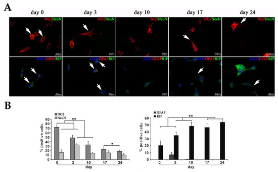 Characterization of diff-Ns by immunofluorescence. (A) Immunofluorescence analysis of GFAP (red), RIP (green), NG2 (red), NeuN (green) and DAPI nuclei (blue) in diff-Ns differentiated as described in Figure 3A. (B) The percentage of positive cells was quantified by counting the number of GFAP-, RIP-, NG2- and NeuN-positive cells as a proportion of blue DAPI positive nuclei. Cells expressing oligodendroglial markers at the days 0 and 3 of differentiation branch short processes from a round and small body (arrows) and extend slim longer branches from a flat and larger cell body at the late days of differentiation (arrows). ** p < 0.01, * p < 0.05 day 3, 10, 17 or 24 versus the previous time of differentiation. Scale bar = 20 μm. Magnification 63×.