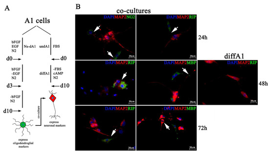 A1-derived oligodendrocytes preserved the expression of the oligodendroglial markers NG2 and RIP. (A) Ns cells differentiated for 10 days as shown in Figure 3A were directly added to A1 cells differentiated towards a neuronal phenotype for 10 days. (B) Co-cultures were immunolabeled with MAP2 (red), NG2 (green), RIP (green), MBP (green) and DAPI nuclei (blue) after 24, 48 and 72 h. NG2 and RIP-positive cells extended processes that frequently reach MAP2-positive cells (arrows). No RIP-positive cells were found in A1 cells differentiated (diffA1) towards a neuronal phenotype. Scale bar = 20 μm. Magnification 63×.