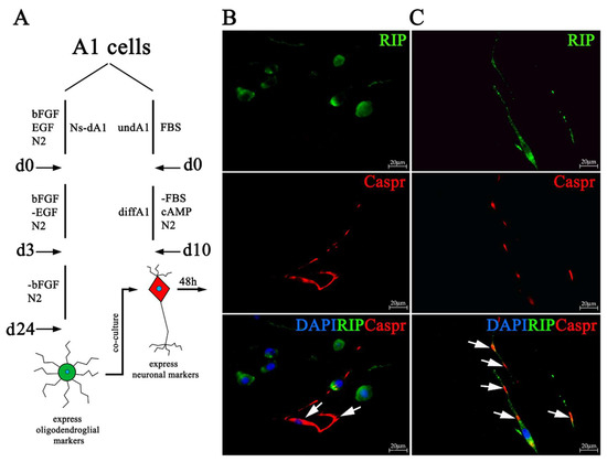Then, as shown in Figure 7A, a co-culture, containing A1-derived oligodendrocytes, differentiated for 24 days and A1 cells at 10 days of neuronal differentiation, was established. Double-immunolabeling with RIP and Caspr/paranodin was carried out. These co-cultures revealed a discontinuous RIP and Caspr-staining when neuronal differentiated A1 cells were closely associated with RIP-positive cells. Arrows reported in Figure 7C point to Caspr-positive regions interspersed with RIP-staining. This specific Caspr/paranodin and RIP localization is consistent with the formation of nodes of Ranvier, in which Caspr/paranodin is expressed at paranodal regions (Figure 7C), which are the site of closest apposition between the membranes of the axon and myelinating glia [26] and are regularly spaced by myelinated internodes. At paranodal regions the transmembrane protein Caspr/paranodin, located on the axolemma, binds the glial component neurofascin-155 [22,27,28]. Neuronally differentiated A1 cells, not interacting with RIP-positive cells in co-cultures, expressed Caspr/paranodin along their entire surface and processes (Figure 7B).