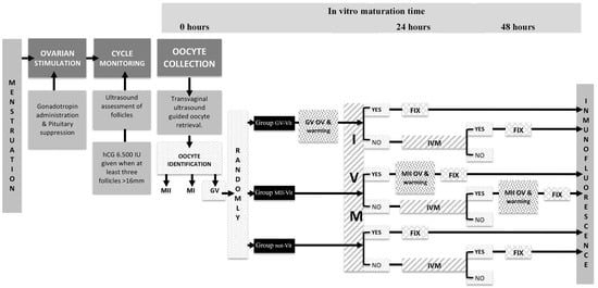 Experimental design that describes in detail the different study groups and the methodology used at the different in vitro maturation times (24 and 48 h). GV, prophase I; MI, metaphase I; MII, metaphase II, OV, oocytes vitrification; IVM, in vitro maturation; FIX, fixation; Vit, vitrification.