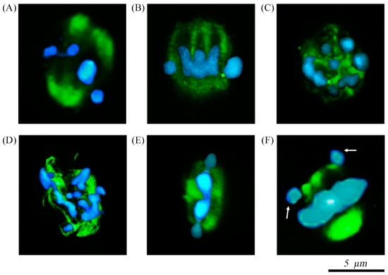 Confocal micrographs of spindle chromosome complexes. Anti-α/β-tubulin antibody and Alexa Fluor 488 to visualize the spindle (green) and DAPI to stain the chromosomes (blue). (A,B) Normal barrel-shaped spindle configuration with chromosomes arranged at the equator of the structure. (C) Normal spindle complex oriented perpendicular to the focal plane and chromosomes arranged in a circular way. (D) Spindle showing completely disorganized appearance with abnormal chromosomes configuration. (E) Spindle complex displaying reduction in the longitudinal dimension of the spindle and compact metaphase plate. (F) Normal spindle conformation with some chromosomes slightly displaced from the plane of the metaphase plate (arrows).