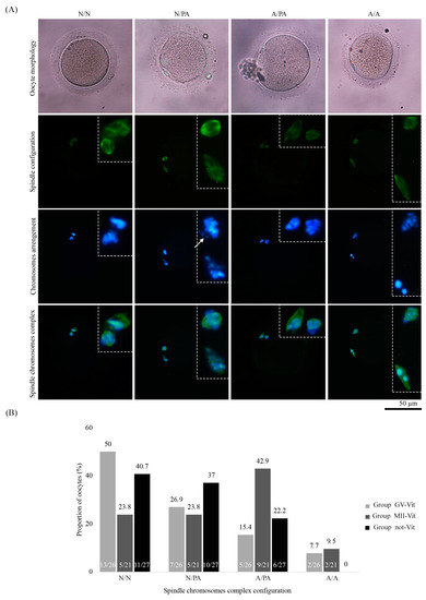 As a result of these observations, four categories regarding spindle and chromosome status were established. The first category involved oocytes with normal configuration of both structures (N/N, Figure 3A). More in detail, a barrel-polymerized spindle positioned perpendicular to the first PB and aligned chromosomes at the equator of the meiotic spindle. The second included oocytes containing a normal spindle and partially abnormal chromosomal arrangement (N/PA, Figure 3A). In this case, some chromosomes are located outside of the spindle equatorial plane (Figure 3). The third category included abnormal spindle configuration (depolymerized spindle) and partially abnormal chromosome distribution (A/PA, Figure 3A). The last category corresponded to oocytes with abnormal spindle and chromosome alignment (A/A, Figure 3A).