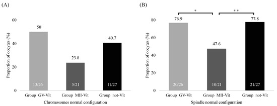Chromosomes and spindle normal configuration of the oocytes in the three groups of study (Group GV-Vit, Group MII-Vit, and Group not-Vit). (A) Chromosomes normal configuration, p-value > 0.05. (B) Spindle normal configuration * p-value Group GV-Vit vs. Group MII-Vit = 0.038 and ** p-value Group MII-Vit vs. Group not-Vit = 0.03.