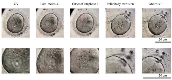 GV oocytes were individually cultured in micro-drops of 25 μL of culture medium covered by mineral oil OVOILTM on 1008 plates at 37 °C and 5% CO2. We used SAGE 1-StepTM (Origio®, Màlov, Denmark) culture medium, supplemented with human menopausal gonadotropin (hMG, Menopur® 75 UI, Ferring®, Madrid, Spain) and synthetic serum substitute (SSS IrvineScientific®, Santa Ana, CA, USA). Oocytes were serially observed under the inverted microscope (Olympus, IX70, Tokio, Japan) 20, 24, 44, and 48 h after the IVM. Mature oocyte (MII) were considered to be those in which a rupture of the GV was observed, and the presence of a first polar corpuscle in the perivitelline space during the first 48 h of culture was observed under inverted optical microscope (Figure 5).