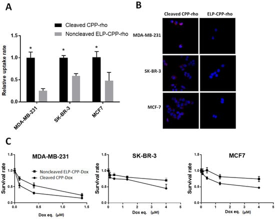 Cellular uptake rate of cleaved CPP-rhodamine in breast cancer cells. (A) Each cellular uptake rate was measured through flow cytometry (* p < 0.05). (B) Merged image of Dox (red) and DAPI (blue). (C) Cytotoxicity of cleaved CPP-Dox on breast cancer cells. Cells were treated with ELP-CPP-Dox and ELP-mmpL-CPP-Dox, both digested by MMP incubation.
