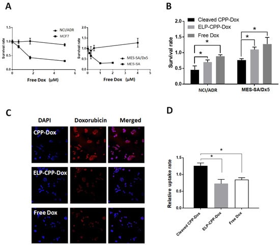 Cytotoxicity of CPP-Dox against Dox-resistant cancer cells. (A) Free Dox killed Dox-sensitive cancer cells (MCF7 and MES-SA), while it spared Dox-resistant NCI/ADR and MES-SA/Dx5. (B) Cytotoxicities of CPP-Dox and ELP-CPP-Dox in NCI/ADR and MES-SA/5DX at 4 µM Dox equivalence. (C) Confocal microscopic images show that CPP-Dox penetrated into NCI/ADR. (D) Flow cytometry, 60% increased uptake in CPP-Dox in comparison with ELP-CPP-Dox and free Dox. * p < 0.05.