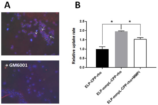 This MMP-cleavable system displays a couple of other advantages in delivering chemotherapeutic molecules. First, when the MMP-cleavable ELP-CPP-drug is digested by MMP in tumor tissue, small fragments (CPP-Dox) will be produced. Since the molecular weight of the released CPP-Dox (<3 kDa) is one-twentieth that of the parental ELP construct (60 kDa), it will quickly infiltrate into adjacent tumor cells, as can be seen in other studies [,]. This hypothesis was examined by cell-uptake assays in this study. Cells treated with CPP-rho, which is a digested product from ELP-mmpL-CPP-rho, showed more rhodamine uptake than the cells treated with undigested ELP-CPP-rho. It is also demonstrated in Figure 5 that the ELP-mmpL-CPP-rho could be digested by endogenous MMPs and taken up by HT-1080 cells. Reversal of this uptake by GM6001 (an MMP inhibitor) indicates that the cell uptake of rhodamine by HT-1080 relies on the catalytic activity of MMP. This increased uptake was reflected in the enhanced cytotoxicity of MMP-cleaved CPP-Dox in breast cancer cells. After MMP-2 digestion, ELP-mmpL-CPP-Dox killed more cancer cells than did ELP-CPP-Dox (Figure 3C).