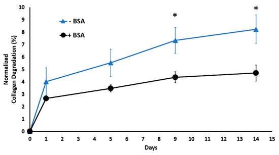 Prior to conducting intensive mechanistic studies, we confirmed the importance of bovine serum albumin (BSA), which is one of the building blocks of the injectable nanofibrous tissue scaffold as a protective agent in a digestive inflammatory environment. BSA demonstrated a protective effect against proteolytic degradation of the scaffold over 14 days (Figure 1). Albumin, particularly bovine serum albumin (BSA), limits surface adsorption and the enzymatic degradation of extracellular matrix protein molecules by interfering with collagenase activity through crowding effects [57]. Furthermore, for MMP1 (collagenase) to function effectively, both soluble calcium ions and zinc ions have to be present in the environment [58,59,60,61]. It is well-known that BSA scavenges metal ions such as zinc, copper, and iron ions within the solution and prevents the activation of matrix degradation enzyme, MMP1 [62,63].