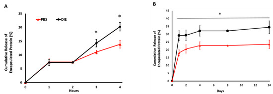 The role of digestive inflammatory environment (DIE) in model protein release profile from injectable scaffolds. (A) Model protein release profile within injectable scaffolds (n = 4) cultured in phosphate buffer saline (PBS) and DIE during time = 0 to 4 h corresponding to the burst release phase and (B) over 14 days. * p < 0.05.