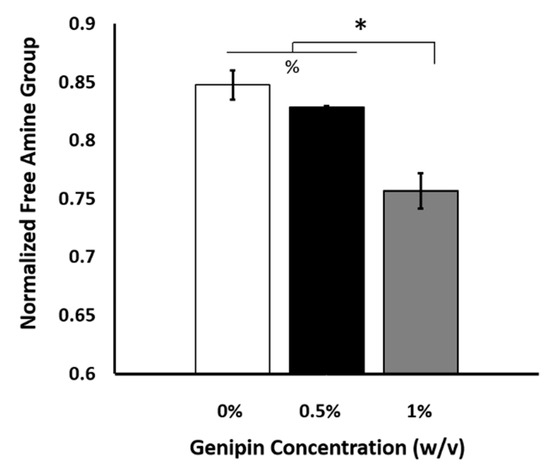 We next investigated genipin as a crosslinking agent to improve the retention rate of encapsulated biologics under a digestive inflammatory environment. It is known that genipin crosslinks protein, collagen, gelatin, and chitosan and forms blue particles as a result of spontaneous reaction with primary amine groups [70,71,72]. Genipin covalently binds free amine groups present in collagen fibers, forming intra-helical and inter-helical links within the standard tropocollagen fiber, and inter-microfibrillar crosslinks (crosslinks between the fibrils that form a collagen fiber) [70,73]. Even on the assumption that genipin is an effective collagen crosslinker, we still need to confirm the optimal genipin concentration for the improvement of scaffold properties and maintaining cell viability before running extensive mechanistic studies. The degree of scaffold cross-linking with increased genipin concentration was assessed through measuring the free amine groups within the scaffold before and after genipin crosslinking (Figure 3). It was demonstrated that genipin, even at the low concentration of 1% (w/v), was able to decrease the free available amine groups within the scaffolds.