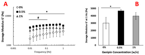 Rheological analysis of genipin crosslinked scaffolds (A) The changes in the storage modulus as a function of frequency for scaffolds crosslinked with various genipin concentration (0%, 0.5%, and 1% (w/v)). (B) Storage modulus at 1 Hz as a function of genipin concentration. Six samples were used for each group (n = 6). (#) denotes a significant difference between frequencies, while (*) indicates a significant difference between sample groups, p < 0.05.