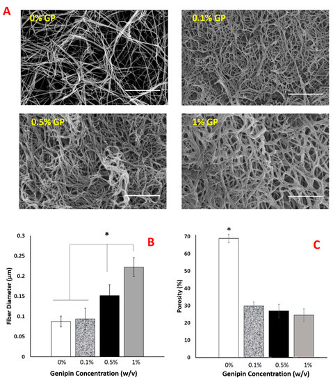 The morphological changes within the scaffolds crosslinked with various genipin concentrations. (A) SEM images of scaffolds show increased fiber thickness with increased genipin concentration. Scale bar is 5 µm for all SEM images. (B) The changes in fiber diameter and (C) porosity as a function of genipin concentration. (*) indicates a significant difference between sample groups, p < 0.05.