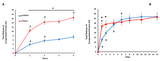 The kinetic protein release study was conducted with and without genipin-crosslinked scaffolds to understand the effect of crosslinking on burst (4-h) and long-term (14-days) encapsulated protein release profiles. The data demonstrated that in total, 7 ± 1.4% of the protein was released from genipin crosslinked scaffolds (gi-PNCOL) within the first four hours (Figure 7A). There was a rapid release for uncrosslinked scaffolds (i-PNCOL) with 10 ± 0.6% within the first hour and in total 16 ± 0.9% within the four-hour period. During the 14-day study, genipin crosslinking prevented the burst release of the encapsulated biologics from the injectable scaffolds. This trend continued for the first two days of the culture (Figure 7B). Starting from day 4, there was no statistical difference in released protein amount between crosslinked (gi-PNCOL) and uncrosslinked (i-PNCOL) scaffolds. However, it should be noted that the cumulative protein release trend for uncrosslinked scaffold (i-PNCOL) was demonstrating the upward trend, while that released from genipin crosslinked scaffolds plateaued around day 6 until the end of day 15.
