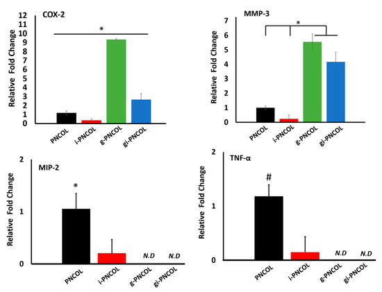 Figure 8 demonstrates the gene expression of hallmark pro-inflammatory (M1) markers of COX-2, MMP-3, MIP-2, and TNF-α. The data demonstrate that IL-4 released from i-PNCOL downregulated all M1 markers. When the scaffold was crosslinked with genipin (g-PNCOL group), COX-2 and MMP-3 expression increased 9.4 ± 0.1-fold and 5.6 ± 0.6-fold, respectively. However, when IL-4 was incorporated into the genipin-crosslinked scaffolds (gi-PNCOL), the released IL-4 decreased the COX-2 and MMP-3 expressions to 2.7 ± 0.7-fold and 4.2 ± 0.7 fold, respectively. The data suggested that genipin crosslinking increased the expression of the pro-inflammatory markers, but the incorporation of IL-4 in the genipin scaffolds can partially attenuate these effects. Interestingly, the expression of MIP-2 and TNF-α decreased for i-PNCOL scaffolds, while the same gene expressions were not detected for g-PNCOL and gi-PNCOL scaffolds.