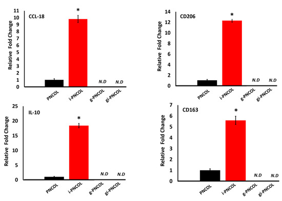 IL-4 released from injectable scaffolds (i-PNCOL) significantly increased the expression of anti-inflammatory markers (Figure 9). CCL-18 expression increased 10 ± 0.6-fold, mannose receptor expression (CD-206) increased over 12 ± 0.3-fold, IL-10 expression increased 18 ± 0.7-fold, and CD163 increased 5.5 ± 0.3-fold. Interestingly, anti-inflammatory marker expression was not detected for g-PNCOL and gi-PNCOL scaffolds (Figure 9). The data strongly indicated that IL-4 released from i-PNCOL, but not genipin-treated scaffolds, was able to differentiate macrophages (M0) to anti-inflammatory lineages; therefore, it was able to promote healing.