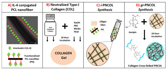 The major steps to synthesize injectable immunomodulatory scaffold, i-PNCOL, and genipin-crosslinked scaffold, gi-PNCOL. (A) Interleukin-4 (IL-4) conjugation on functionalized polycaprolactone (PCL) nanofibers, (B) Neutralizing collagen solution, (C) Incorporation of IL-4 conjugated PCL nanofibers in collagen to create i-PNCOL, (D) crosslinking i-PNCOL using genipin to create gi-PNCOL.