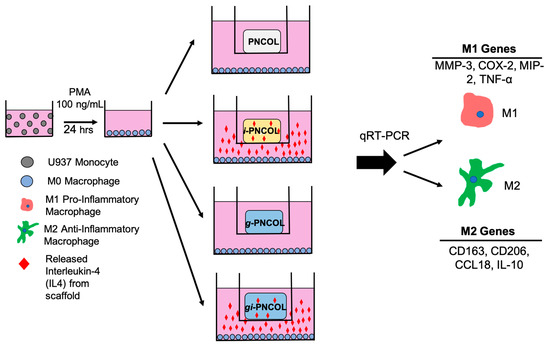 After PMA treatment and subsequent overnight incubation (as described above), the cells were allowed to adhere to the bottom of 12-well transwell plates at a density of 1 × 106 cells/well. The immunomodulatory scaffold (i-PNOCL) or genipin-crosslinked immunomodulatory scaffold (gi-PNCOL) were synthesized (as described in Section 4.1) and transferred to the top chamber of transwell culture inserts (Ø = 12 mm, pore size 3 μm, Corning, Corning, NY, USA). The wells were filled with fresh RPMI media (1.5 mL) and placed in the incubator for 4 days.
