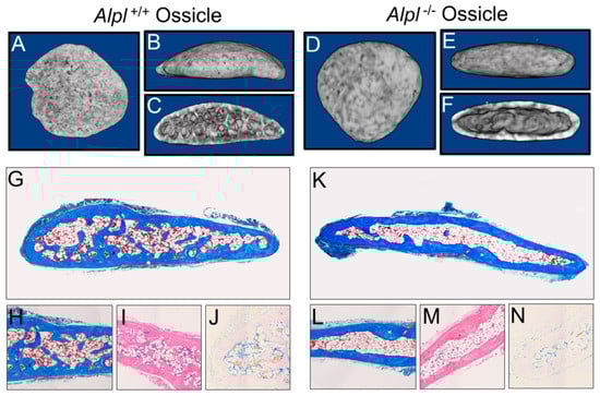 Representative nano CT isosurface renderings and histology of Alpl+/+ and Alpl−/− ossicles after eight weeks of implantation. (A–F), Nano CT isosurface renderings of Alpl+/+ (A–C) and Alpl−/− (D–F) ossicles after 8 weeks of implantation. (G–N), Histologic stains of Alpl+/+ (G–J) and Alpl−/− (K–N) ossicles after 8 weeks of implantation. (G–J), Alpl+/+ ossicles and (K–N), Alpl−/− ossicles. Mason’s trichrome (G,H,K,L); hematoxylin and eosin (I,M); alkaline phosphatase (J,N) stains. Note lack of bone trabeculae in Alpl−/− ossicles as seen by histology and isosurface images.