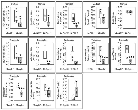 Cortical and trabecular bone parameters of Alpl+/+ and Alpl−/− ossicles. Results shown are means ± standard error. n = 5 per genotype. cort = cortical; trab = trabecular; * p value < 0.05 between genotypes; ** p value < 0.01 between genotypes; *** p value < 0.005 between genotypes, **** p value < 0.001.
