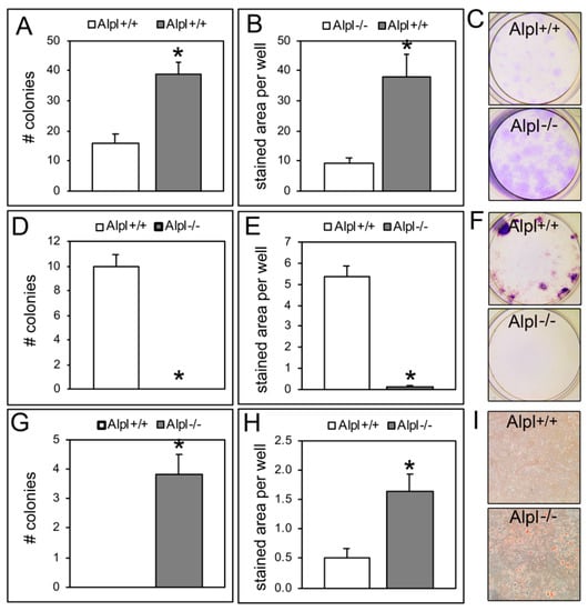Alpl−/− bone marrow stromal cells exhibit increased total colony forming units and adipocyte colony forming units. (A) The total number of crystal violet-stained colonies was significantly increased in Alpl−/− compared to Alpl+/+ BMSCs (bone marrow stromal cells). (B) The area of crystal violet stain per well significantly increased in Alpl−/− compared to Alpl+/+ BMSCs. (C) Representative images of crystal violet stain in Alpl+/+ BMSCs and Alpl−/− BMSCs. (D) The total number of colonies stained for alkaline phosphatase significantly decreased in Alpl−/− compared to Alpl+/+ BMSCs. (E) The area of alkaline phosphatase stain per well significantly decreased in Alpl−/− BMSCs. (F) Representative images of alkaline phosphatase stain in Alpl+/+ BMSCs and Alpl−/− BMSCs. (G) The total number of colonies stained with oil red (for adipocytes) significantly increased in Alpl−/− as compared to Alpl+/+ BMSCs. (H) The area of oil red stain per well significantly increased in Alpl−/− BMSCs. (I) Representative images of oil red stain in Alpl+/+ BMSCs and Alpl−/− BMSCs. n = 3 per genotype. * p < 0.05, statistical significance between genotypes. # = number.