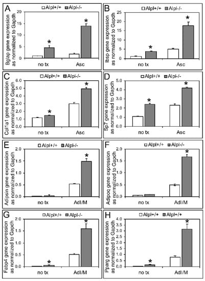 TNAP deficiency increases osteoblastic and adipocytic differentiation in Alpl−/− bone marrow stromal cells (BMSCs) as assessed by gene expression. The osteoblast genes, Bglap (A), Ibsp (B), Col1a1 (C), and Sp7 (D) significantly increased in the Alpl−/− compared to Alpl+/+ BMSCs, when cultured in non-differentiation media (no tx) or osteoblast differentiation media containing ascorbate (Asc) for 6 days. The adipocyte genes, Adipsin (E), Adipoq (F), Fabp4 (G), and Pparg (H) significantly increased in the Alpl−/− compared to Alpl+/+ BMSCs, when cultured in adipocyte induction then maintenance media (AdI/M) for 6 days total. Passage 2 cells were used. n = 3 per genotype. * p < 0.05, statistical significance between genotypes.