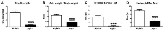 Because individuals with hypophosphatasia exhibit muscle weakness in addition to motor coordination deficiencies, we assessed Alpl−/− mice for muscle strength and coordination as compared to wild type littermates (Figure 5). Grip strength and grip strength normalized for body weight were significantly decreased in Alpl−/− mice, compared to their Alpl+/+ littermates. In addition, Alpl−/− mice fell off the inverted screen and horizontal bar much earlier, as compared to the Alpl+/+ mice.