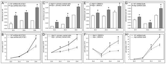 TNAP deficiency increases progenitor cell metabolic activity concurrent with decreased progenitor cell proliferation. (A) Cell metabolic activity (as measured by reduction of the tetrazolium dye, MTT) is significantly increased in Alpl shRNA treated MC3T3E1 cranial osteoprogenitors at days 2, 4, and 6 after plating, as compared with non-target control shRNA treated MC3T3E1 cells. (B) The number of cells is significantly decreased in Alpl shRNA MC3T3E1 cranial osteoprogenitors at days 2, 4, and 6 after plating, as compared with non-target shRNA MC3T3E1 cells. Similar results (increased metabolic activity with decreased proliferation) were also found for Alpl−/− compared to Alpl+/+ primary cranial cells (C,D); Alpl−/− compared to Alpl+/+ bone marrow stromal cells (BMSCs) (E,F); and Alpl shRNA as compared to non-target shRNA Sol8 skeletal muscle progenitor cells (G,H). n = 3 per genotype. * p < 0.05, statistical significance between genotypes. The Sol8 cell growth experimental period is shorter due to higher proliferation rate of these, as compared to the other cell types. Note: standard deviations were very low in some groups such that, while present, the bars are not visually apparent on the graphs (A,C,E,G).