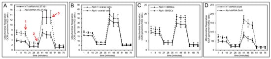 TNAP deficiency increases mitochondrial respiration and oxygen consumption rate. Seahorse XF cell mito stress tests (Agilent) were performed to confirm an effect of TNAP on live cell metabolic activity. Red arrows demark when cells are exposed to respiration modulators. 1 = oligomycin (inhibits ATP synthase; reflects loss of ATP linked respiration); 2 = FCCP (disrupts the mitochondrial membrane potential; reflects maximal respiration); 3 = Rotenone + Antimycin (inhibit mitochondrial proton pumps; reflect nonmitochondrial respiration driven by processes outside the mitochondria). Minutes 1–15 reflect basal cellular oxygen consumption rate (OCR). Minutes 15–35 reflect loss of ATP linked OCR. Minutes 41–55 reflect maximal OCR. Basal and maximal OCR appear increased in in Alpl shRNA treated vs. non-target shRNA MC3T3E1 cells (A), in Alpl−/− vs. Alpl+/+ primary cranial osteoprogenitor cells (B), in Alpl−/− vs. Alpl+/+ BMSCs (C), and in Alpl shRNA treated vs. non-target shRNA Sol8 skeletal progenitor cells (D). n = 3 per genotype per experiment. Statistical comparisons for key parameters of mitochondrial function are shown in Table 1.