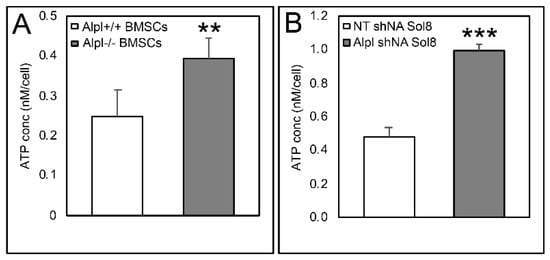 TNAP deficiency increases intracellular ATP levels. The intracellular ATP concentration significantly increased in Alpl−/− BMSCs (A), and Alpl shRNA treated Sol8 cells (B). n = 3 per genotype per experiment. ** p < 0.01, *** p < 0.001, statistical significance between genotypes.