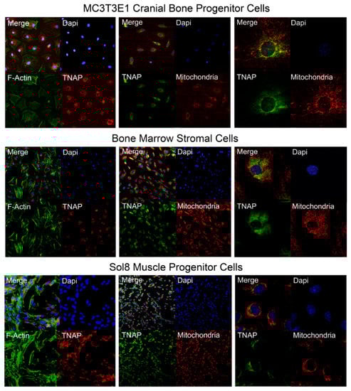 Undifferentiated MC3T3E1 cranial bone progenitor cells, bone marrow stromal cells and Sol8 skeletal muscle progenitor cells were stained by immunofluorescence using Alexa Fluor 488 phalloidin for detection of F-actin (Thermo Fisher, Waltham, MA, USA), a rabbit anti-ALPL primary antibody (ab65834; Abcam, Cambridge, MA, USA), goat anti-rabbit Alexa Fluor-555 secondary antibody (Invitrogen, Carlsbad, CA, USA), and DAPI (4′,6-diamidino-2-phenylindole) nuclear stain to initially establish cellular localization of TNAP. For potential detection of co-localization of TNAP with mitochondria, cells were treated with 100 nM MitoTracker Red CMXRos (Invitrogen, Carlsbad, CA, USA) for 45 min. The mitochondrial dye was removed, and the cells were fixed. Cells were then stained with a monoclonal rat anti-ALPL primary antibody (MAB29091; R&D Systems, Minneapolis, MN, USA), donkey anti-rat Alexa Fluor-488 secondary antibody (Invitrogen, Carlsbad, CA, USA), and DAPI nuclear stain. Immunofluorescent staining was imaged using a Nikon Eclipse Ti microscope.