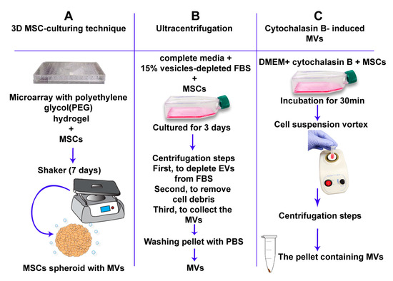 Formation of artificial MVs. Three separate approaches for the artificial formation of MVs. (A) The 3D mesenchymal stem cell (MSC)-culturing technique uses polyethylene glycol hydrogels to form spheroid MSCs. MSC-spheroids are subsequently cultured for 7 days on a 30-rpm orbital-shaker (3D w/shaking). Scalable pro-duction of MSC-derived MVs can be achieved by this method. (B) The ultracentrifugation approach. This includes numerous centrifugation steps. MSCs are first cultured with complete media supplemented with 15% vesicle-depleted fetal bovine serum (FBS) for 3 days. MSCs are then centrifuged at 120,000× g for 18 h to deplete extra-cellular vesicles from FBS. The cell solution is centrifuged at 300× g for 30 min at 4 °C to remove whole cells and large debris. Supernatants are then centrifuged at 16,500× g for 20 min at 4 °C to collect the MV fraction [149]. (C) Cytochalasin B-induced MVs. This approach depends on the incubation of MSCs with cytochalasin-B to obtain MVs.