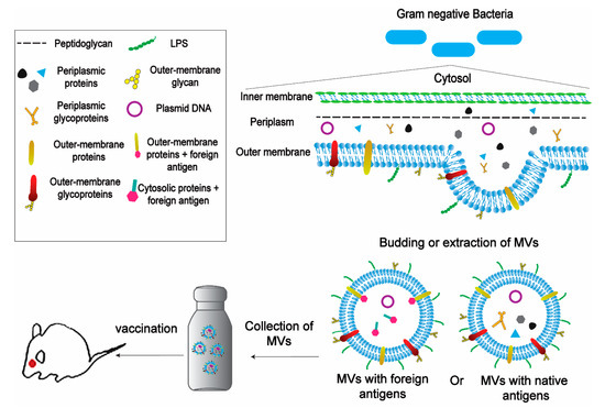 Schematic representation of the application of bacteria-derived MVs in vaccines. MVs can be obtained from Gram-Negative Bacteria naturally by budding or by detergent extraction. MVs can carry native antigens (including proteins, glycans and glycoproteins) or can be engineered to carry foreign antigens fused with outer-membrane proteins or cytosolic proteins. The next step is to isolate and purificate MVs and then collect them in large scale amounts.The MVs’ amount has to be suitable for using in the vaccination process. Then, the MV-based vaccine is performed on animals in non-invasive ways with the possibility of a booster dose.