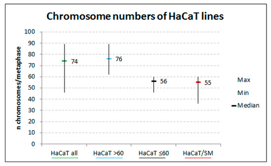 Chromosome numbers in HaCaT/sulfur mustard (SM) and HaCaT. HaCaT parents (all) and subclones (≤60 and >60 chromosomes) are shown. The bars indicate the median. The whiskers indicate the range (min, max). Numbers are based on the analysis of 75 metaphases/cell line.