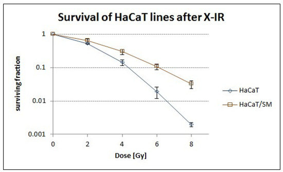 Survival of HaCaT after irradiation. Cellular survival after increasing doses of X-ray ionizing radiation (IR) shows a radioresistant phenotype of the HaCaT/SM cell line, especially at higher doses, as revealed by clonogenic assay (data are based on three replicate experiments ± SD).