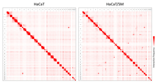 Genome-wide detection of chromosomal translocations by Hi-C interaction matrices for HaCaT (left) and HaCaT/SM (right). Red color saturation corresponds to the number of Hi-C interactions between chromosomal regions and, hence, their probability of spatial proximity within the nucleus. Chromosome numbers are given at the top and to the left of each matrix. See text for further explanations. Juicebox was employed for visualization of Hi-C data [43]. Enlarged views of t(4;18) and t(19;22) are exemplarily provided in Supplementary Figure S1. Genomic coordinates of translocations are given in Supplementary Table S2.
