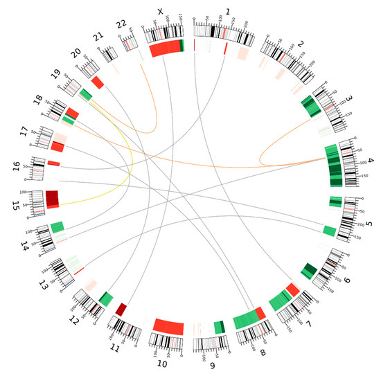 Next, we performed a genome-wide screen for chromosomal translocations. Translocations drastically change the spatial proximity of chromosomes within the nucleus. This fact can be used to infer chromosomal translocation partners and chromosomal breakpoints on the basis of analysis of chromosome interaction probabilities by means of Hi-C [38,39,40,41,42] (Figure 3; Supplementary Table S2).