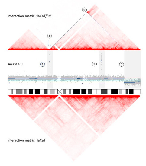 A great proportion of HaCaT/SM specific copy number alterations were adjacent to translocation breakpoints (Figure 4). On the example of chromosome X, integrative analysis of Hi-C and array CGH data revealed that seemingly simple and independent structural aberrations were connected and resulted in considerable conformational changes in the affected chromosome (Figure 5). This rearrangement of chromosome X was exclusively present in array CGH and Hi-C data, but absent in whole-genome sequencing (WGS) data, indicating that this change occurred at a later stage of SM exposure.