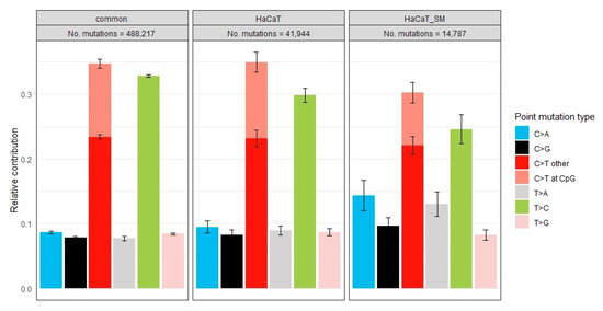 Altogether, this subset of SNVs, mapping to eight chromosomal regions lacking prominent differences in DNA copy number and local bias in mutation frequency between the two cell populations, comprised 488,217 common, 41,944 HaCaT-specific, and 14,787 HaCaT/SM-specific SNVs. As can be inferred from the mutation type frequency plot provided in Figure 6, with reference to the pyrimidine of the DNA double strand, the set of HaCaT/SM-specific SNVs was characterized by a higher rate of C > A and T > A transversions at the cost of T > C and C > T transitions, the latter particularly in the CpG dinucleotide context. An increase in C > A transversions can also be caused by 8-oxoguanine modifications arising in the course of sequencing library preparation [49]. As this artefact should affect both DNA strands with similar frequency, we tested the strand-specificity of all genic SNVs. This analysis revealed a significant bias of C > A transversions toward the transcribed strand (Supplementary Figure S4), making a preparation-derived artefact unlikely.